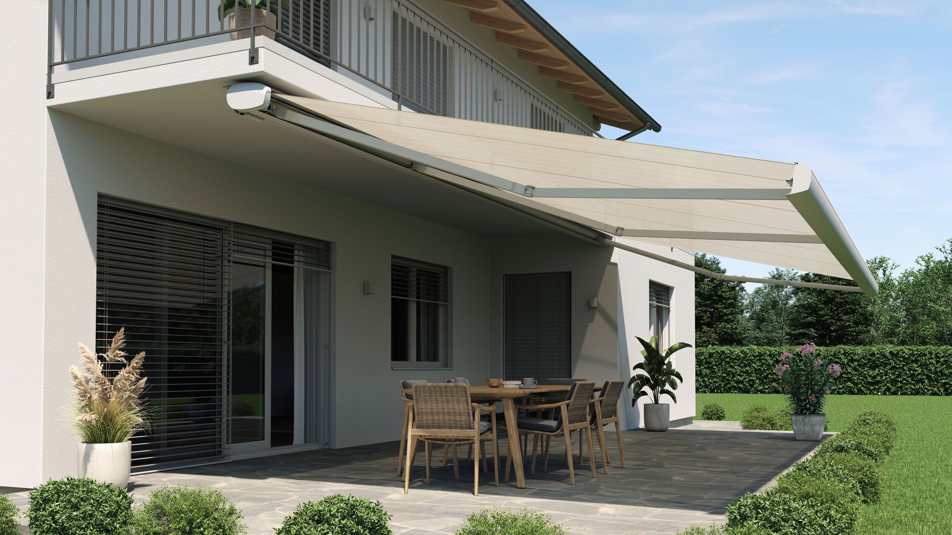 Bei direkter Sonneneinstrahlung heizt sich die unmittelbare Umgebung auf. Markisen schützen nicht nur vor schädlichen UV-Strahlen, sie verhindern auch das Aufheizen des Wohnbereichs. Dabei lässt der Schatten spendende Sonnenschutz noch immer genügend Licht in die Wohnung. Die Markise ist sehr beliebt und komfortabel in der Bedienung. Sie wird fest an der Hauswand installiert und kann durch eine Kurbel oder einen Motor ein- und ausgefahren werden.